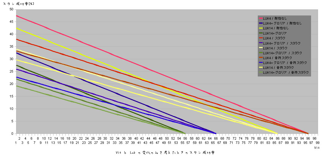 スタン成功率=基本スタン率*耐性*(100-自Vit+詠唱者Lv-自Lv-自Luk)/100